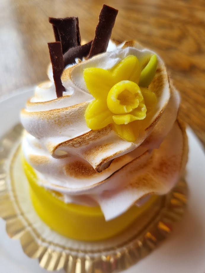 Sockerkaksbotten med vanilj- och citronkräm, med hallon under italiensk maräng.